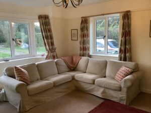 - Lounge – with L-shaped sofas, coffee table and TV unit and patio doors to the garden.