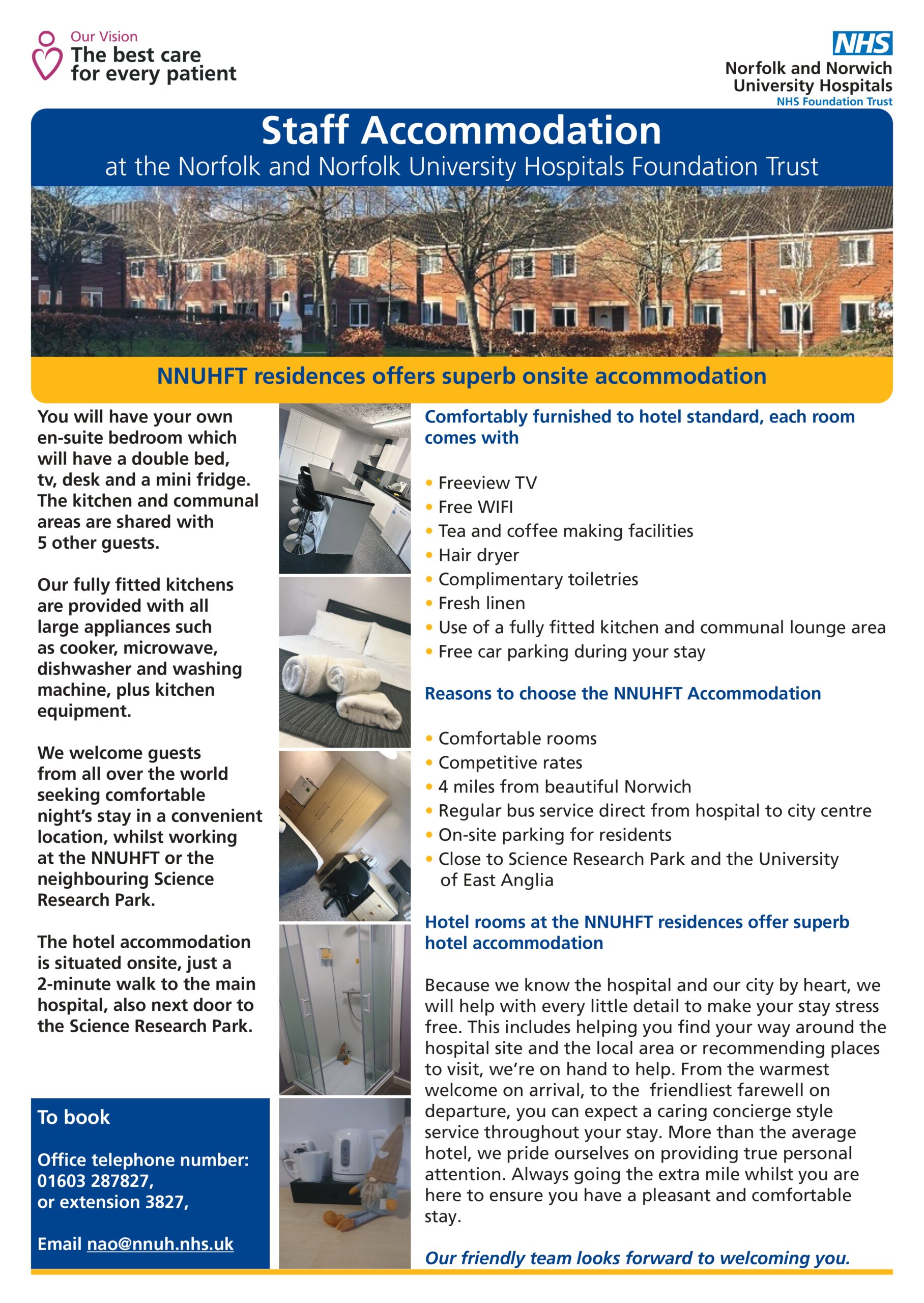 We welcome guests from all over the world, seeking comfortable accommodation in a convenient location, whilst working at the NNUHFT or the neighbouring Science Research Park.