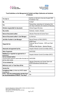 This policy aims to ensure an effective and coordinated approach is taken in the assessment and management of an outbreak from initial detection to formal closure of the outbreak and review of lessons learnt. The main purpose of this policy is to ensure that prompt action is taken in order to limit the extent of any outbreak and therefore protect patients staff and visitors from avoidable harm.